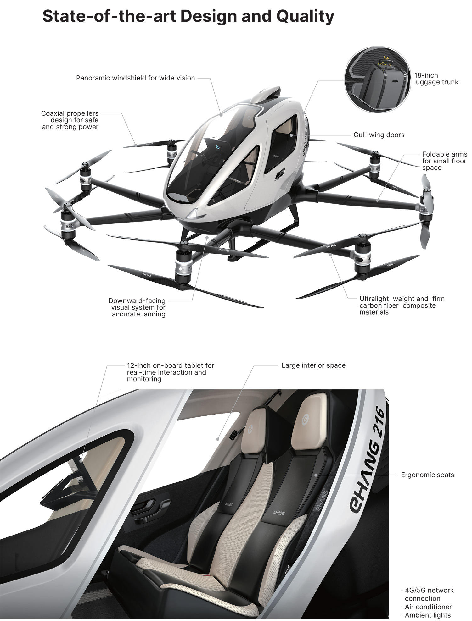 The world's first electric passenger-grade Autonomous Aerial Vehicle, providing safe, eco-friendly, intelligent Urban Air Mobility solution.